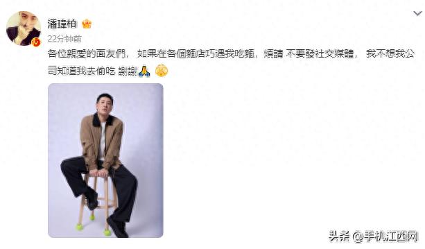 7月22日,潘瑋柏在微博發(fā)文:各位親愛的面友們,如果在各個(gè)面店巧遇我吃面,煩請不要發(fā)社交媒體,我不想我公司知道我去偷吃,謝謝。