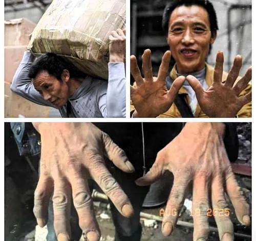 手指關節因常年負重,嚴重變形,就像彎曲的老樹根!