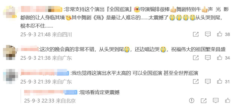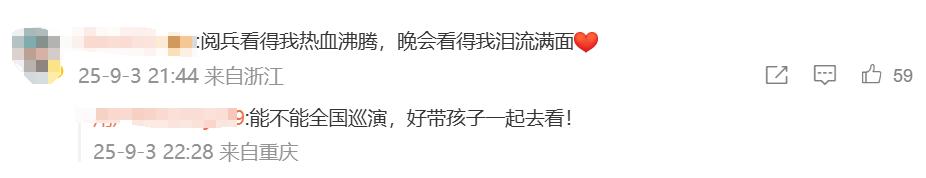 網友在觀看過程中,紛紛留言評論,“閱兵看得我熱血沸騰,晚會看得我淚流滿面”“看得直起雞皮疙瘩”“建議文藝晚會全國巡演”……