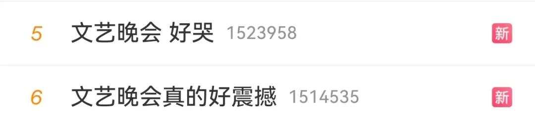 至晚會結束時止,包括“文藝晚會”“文藝晚會 好哭”“文藝晚會真的好震撼”“九三晚會這束光”“劉敏濤給我演哭了”“這是胡先煦嗎”“吳越吳樾”“雷佳音和小棟哲”“抗戰勝利80周年文藝晚會”“劉昊然臺詞”“羅晉臺詞”“文藝晚會節目”“文藝晚會節目單”“文藝晚會看到郭京飛了”“文藝晚會舞蹈殤源自紫金草女孩”等詞條登陸熱搜。