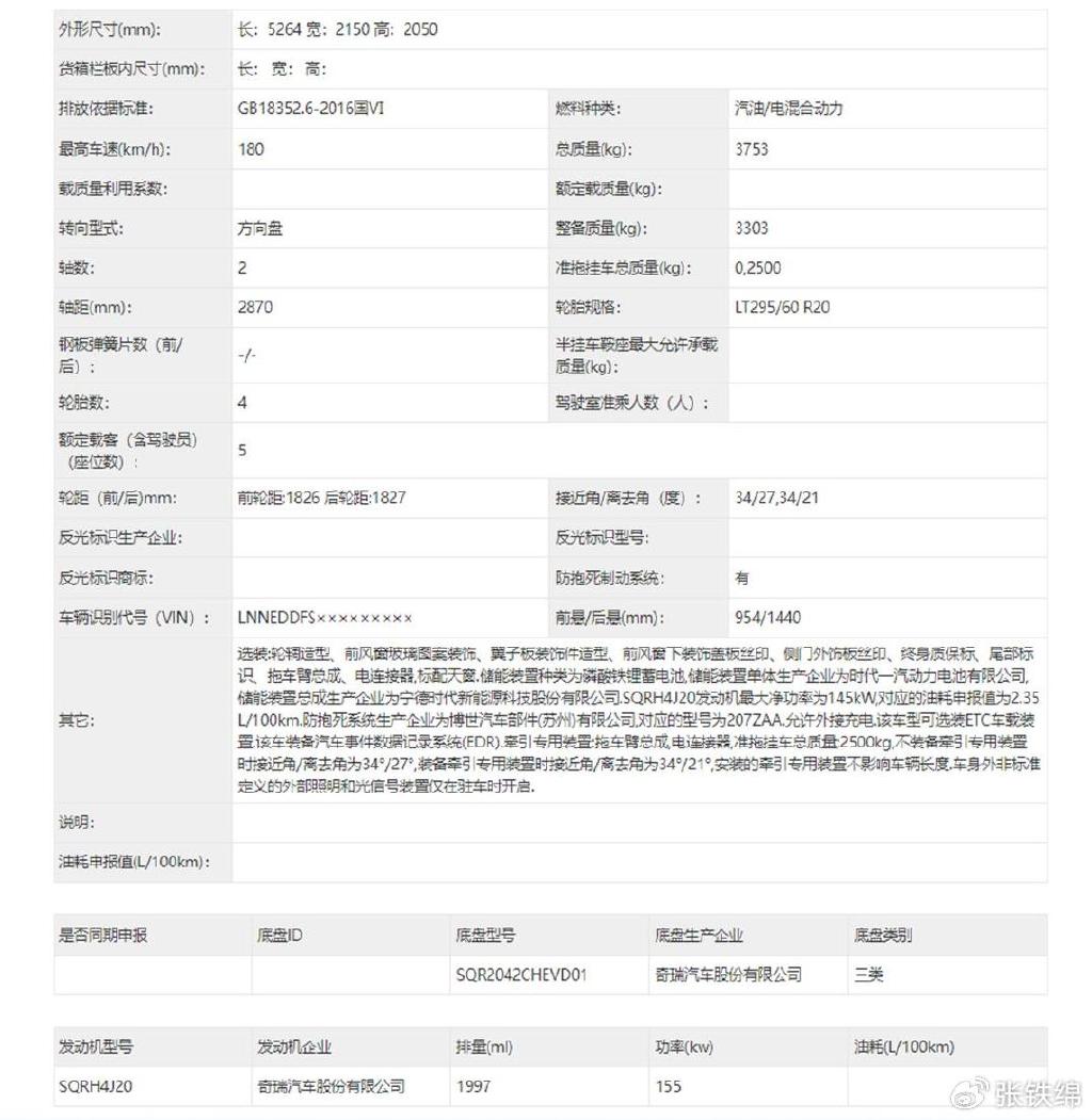 車尾部分,后風擋兩側的黑色飾板使用了新的造型,后杠也經過了重新設計,造型更為硬朗立體,還會提供帶有拖車臂的版本。尺寸方面,此次申報的新車型長寬高分別為5264/2150/2050mm,軸距為2870mm,車內采用的是5座布局。