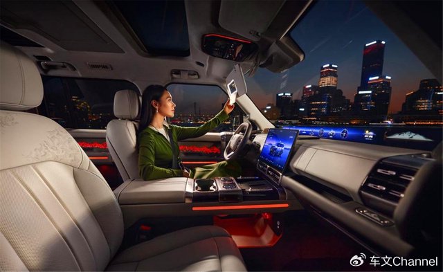 內飾也是偏科技和時尚,采用橢圓形方向盤,應用懷擋式換擋桿,副儀表臺區域配有眾多物體按鍵。同時,配備35.4英寸天際遠端屏和15.6英寸2.5K懸浮中控屏組合。內置縱橫OS智能車機系統,搭載高通驍龍8255芯片。在配色方面,新車提供黑/橙、黑/米、黑/灰共3款雙拼色可選。