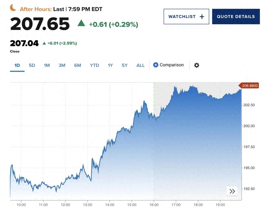 10月29日,美股開盤不久,英偉達股價一度上漲5.44%,盤中觸及212.19美元/股,收盤價穩定在207.04美元/股。