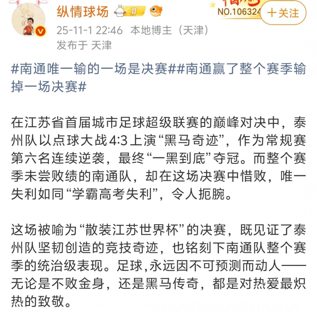 而對于本場比賽賽后也是引發(fā)媒體人熱議,體育博主“縱情球場”表示:“在江蘇省首屆城市足球超級聯(lián)賽的巔峰對決中,泰州隊以點球大戰(zhàn)4:3上演“黑馬奇跡”,作為常規(guī)賽第六名連續(xù)逆襲,最終“一黑到底”奪冠。而整個賽季未嘗敗績的南通隊,卻在這場決賽中惜敗,唯一失利如同“學(xué)霸高考失利”,令人扼腕。這場被喻為“散裝江蘇世界杯”的決賽,既見證了泰州隊堅韌創(chuàng)造的競技奇跡,也銘刻下南通隊整個賽季的統(tǒng)治級表現(xiàn)。足球,永遠(yuǎn)因不可預(yù)測而動人——無論是不敗金身,還是黑馬傳奇,都是對熱愛最熾熱的致敬。”