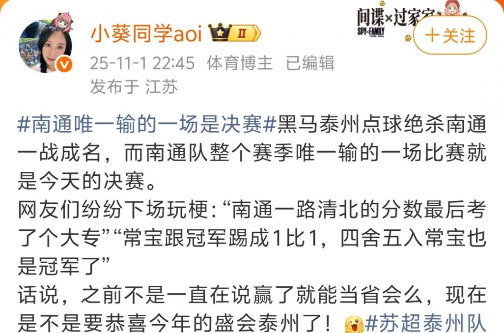 體育博主“小葵同學(xué)aoi”表示:“黑馬泰州點球絕殺南通一戰(zhàn)成名,而南通隊整個賽季唯一輸?shù)囊粓霰荣惥褪墙裉斓臎Q賽。網(wǎng)友們紛紛下場玩梗:“南通一路清北的分?jǐn)?shù)最后考了個大專”“常寶跟冠軍踢成1比1,四舍五入常寶也是冠軍了”話說,之前不是一直在說贏了就能當(dāng)省會么,現(xiàn)在是不是要恭喜今年的盛會泰州了!”