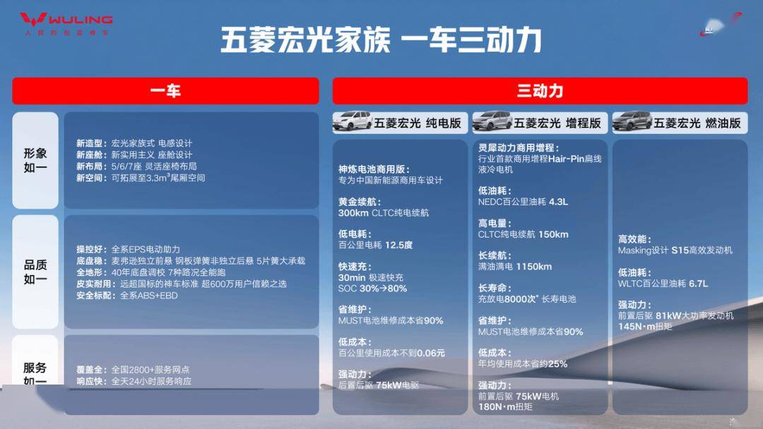 新款五菱宏光家族提供純電、增程、燃油三種動力總成,純電版CLTC純電續航300km,百公里電耗低至12.5度,支持30分鐘極速快充(SOC 30%至80%),百公里使用成本不到6分錢,搭配后置后驅75kW強動力電機。