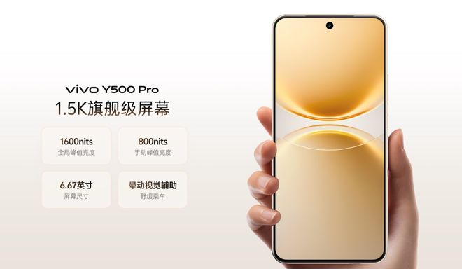 屏幕配置上,vivo Y500 Pro屏幕有1.37mm窄黑邊,首次采用6.67英寸1.5K旗艦級護眼屏,據稱這是Y系列全渠道產品首次突破超視網膜PPI。