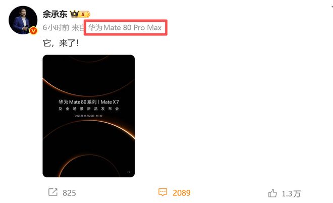 就在今天,華為正式官宣 11 月 25 日要發布Mate80 系列。更有意思的是,余承東直接用 Mate80 Pro Max 發了一波動態,機型“小尾巴”藏都藏不住。