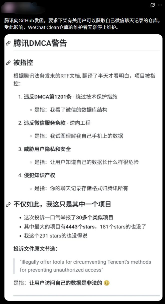 其中,較受關注的項目之一 WeChat Clean,其維護者已公開表示:在法律壓力下,項目被迫停止維護